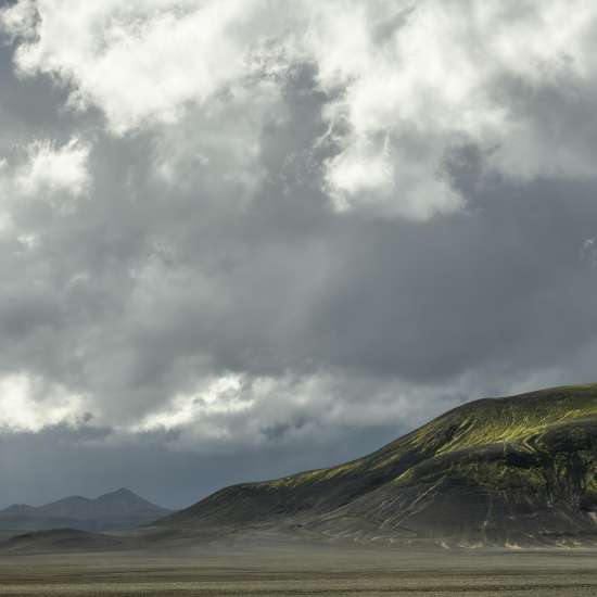 Throughout the differing areas of the Highlands of Iceland you are forever surrounded by evidence of volcanic activity. Landscapes that are monochromatic, covered in ash, showing very few signs of life as they have not yet had time to establish vegetation, remain lunar-like and barren. For many landscape photographers this may appear to be the least appealing environment in which to work. Furthermore, as there is very little colour and the ground is dark, when the cloud and rains arrive it can feel quite