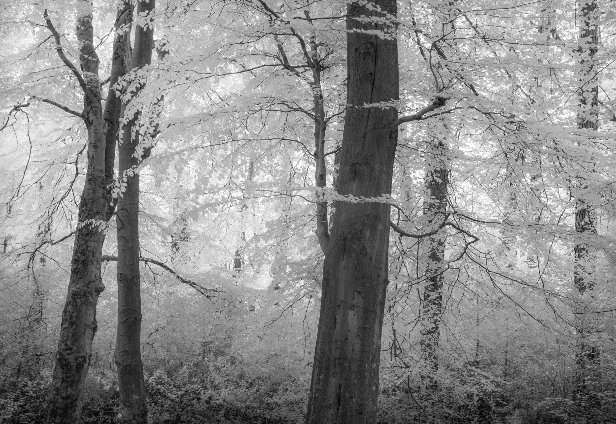 I began by heading out in what a lot of infrared photographers considered the poorest conditions, overcast days with hardly any direct sun – in fact, I was discovering that virtually no sun at all gave me the tones I wanted. I also soon discovered that the use of filters became almost redundant. Because of the narrow histogram and the way the camera records a narrow bandwidth of light, there were hardly any situations where I felt the need to fit a graduated filter, as the highlights were recorded beautifully. One of the frequent challenges to photographing trees is the dynamic range of the subject.